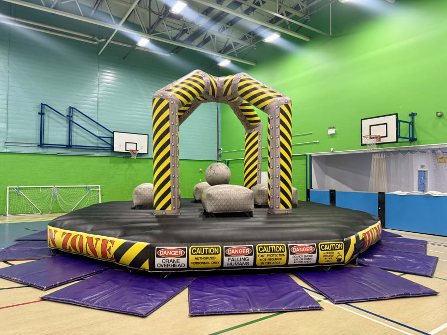 • Inflatable arena with soft platforms and a centrally mounted swinging wrecking ball — designed for safe, competitive fun.