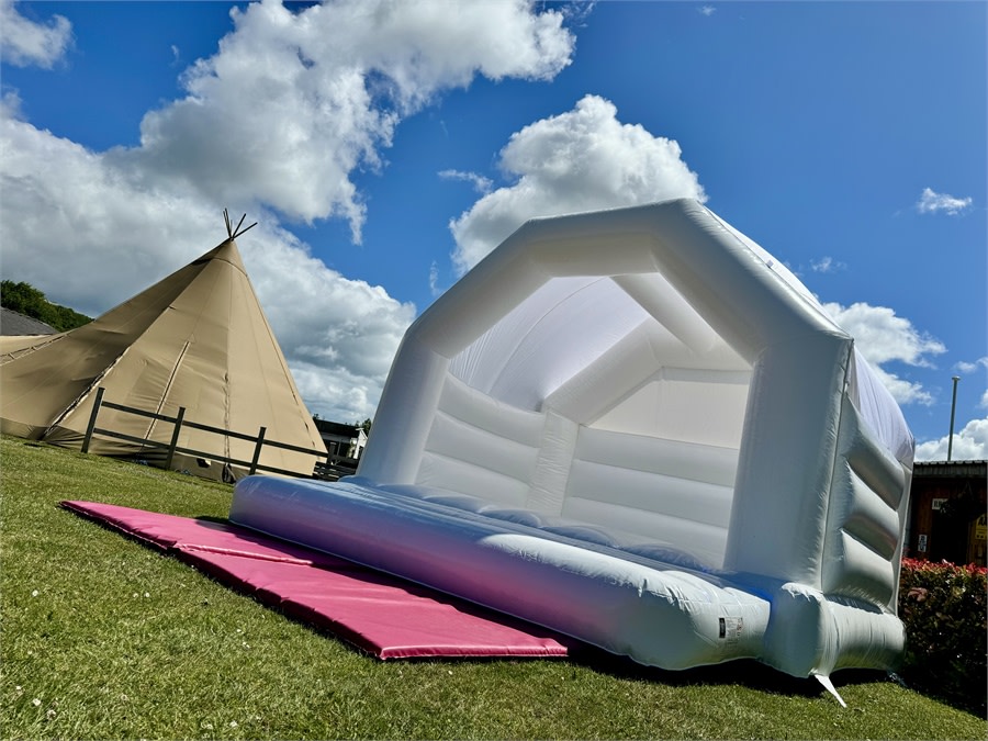White Wedding Bouncy Castle Hire 15ft x 15ft White Wedding Castle in Torquay, Paignton, Brixham, Newton Abbot, Totnes, South Hams, Teignmouth, Dawlish, Exeter, Devon, Cornwall. ππ€