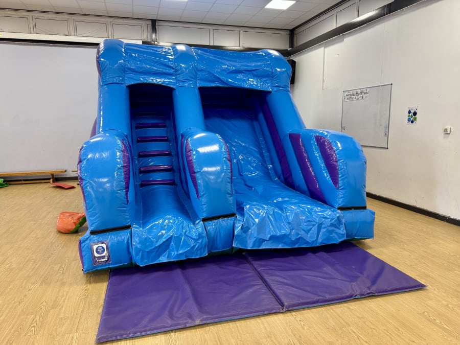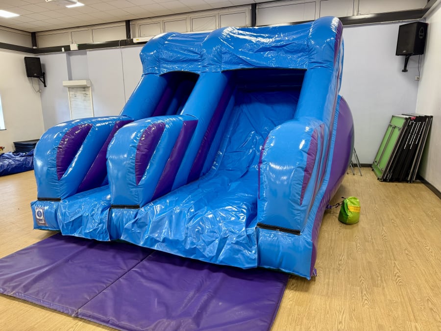 Rent a colourful, compact slide for parties and events. The 6.5ft Platform Blue & Purple Party Slide delivers big fun in a small footprint. With an overall height of just 10ft, it fits most village halls, school gyms and back gardens. Ideal for children's birthday parties and garden hires. This slide complements our bouncy castles to create the perfect party package. 🛝🎈