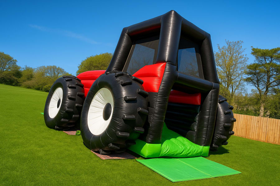 Tractor Bouncy Castle Hire 30ft Tractor Funrun in Torquay, Paignton, Brixham, Newton Abbot, Totnes, South Hams, Teignmouth, Dawlish, Exeter, Devon, Cornwall brings the ultimate red-tractor adventure to your event. Our 30ft Big Red Tractor features an exciting road work biff bash play zone and a thrilling 8ft platform slide. Perfect for birthday parties, village fêtes, school fairs and family fun days. Easy to book. Big on fun. Safe and eye-catching. 🛝✨