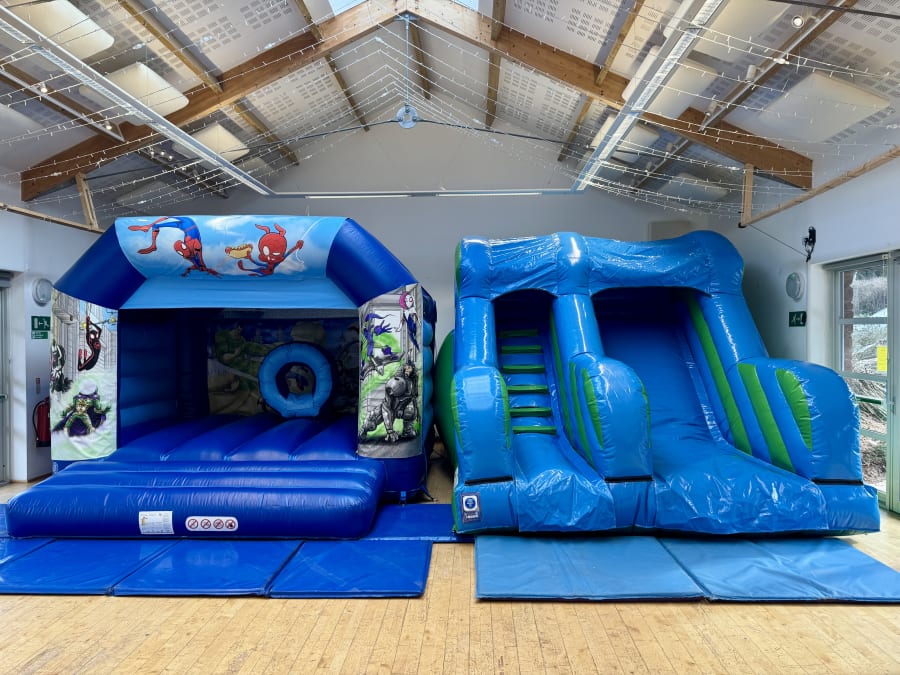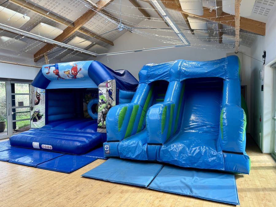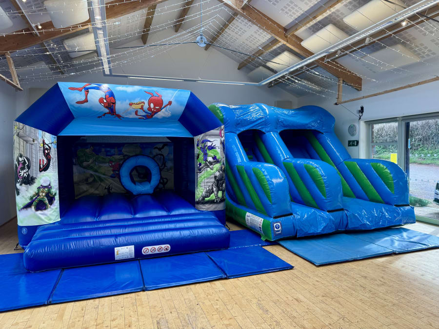 Spiderman Bouncy Castle With Slide Hire In Devon Spiderman Bouncy Castle With Slide Package in Torbay, Torquay, Paignton, Brixham, Newton Abbot, Totnes, South Hams, Teignmouth, Dawlish, Exeter, Devon.